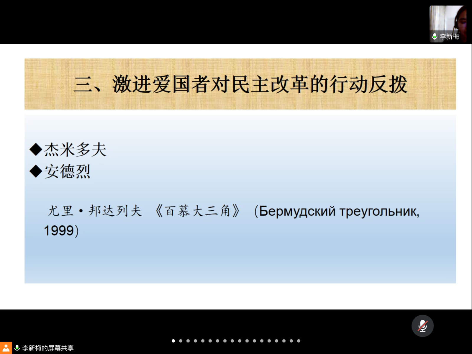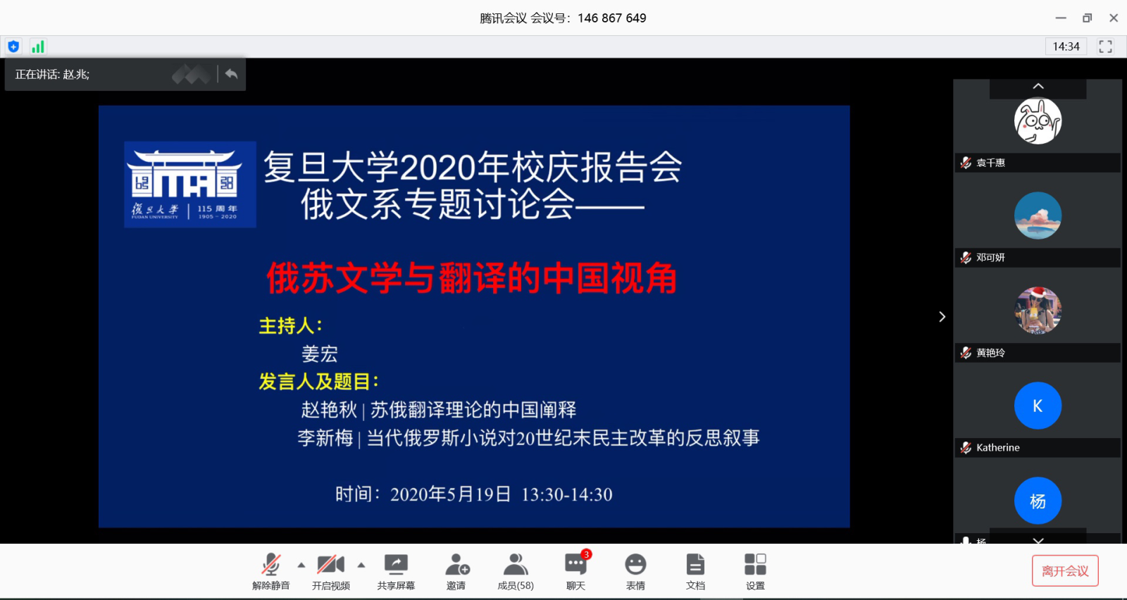 2020年5月19日,High漫画 High漫画 俄文系2020年校庆学术报告会暨专题讨论会“俄苏文学与翻译的中国视角”成功在线举办。会议由俄文系主任姜宏教授主持,俄文系教师赵艳秋、李新梅分别进行报告。60多位师生参会。