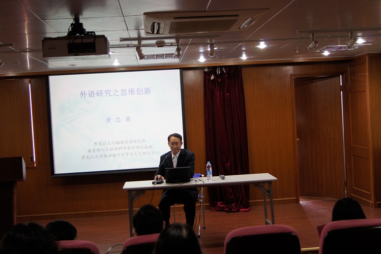 在讲座中,黄教授以自己身跨外语界和汉语界的学术生涯现身说法,抽丝剥茧、条分缕析、逐层深入地讲述了如何分析实例,如何从现象到本质,从多方位挖掘研究课题,在外语研究中真正做到思维创新。黄教授讲座生动有趣,连举八个实例进行分析,中、英、俄三语并用,环环相扣,最后以“从归纳推理走向类比或演绎推理”作结,令在场的听众顿觉恍然大悟,意犹未尽。
