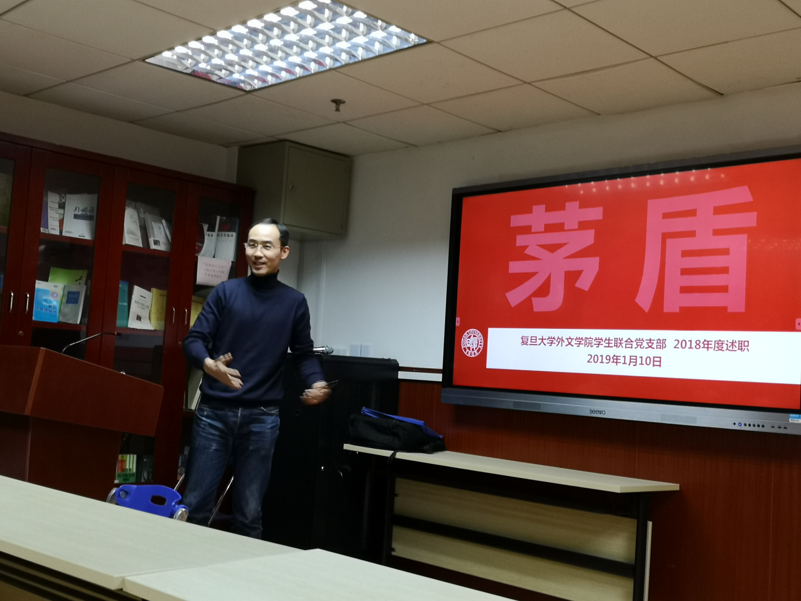 2019年1月10日下午,High漫画 学生党总支在文科楼424会议室举行学生党支部书记年度述职会。High漫画 党委书记罗英华,党委副书记、学生党总支书记赵昕,学生党总支副书记王亚鹏、茅盾,学生党支部书记、部分辅导员等参加述职会。