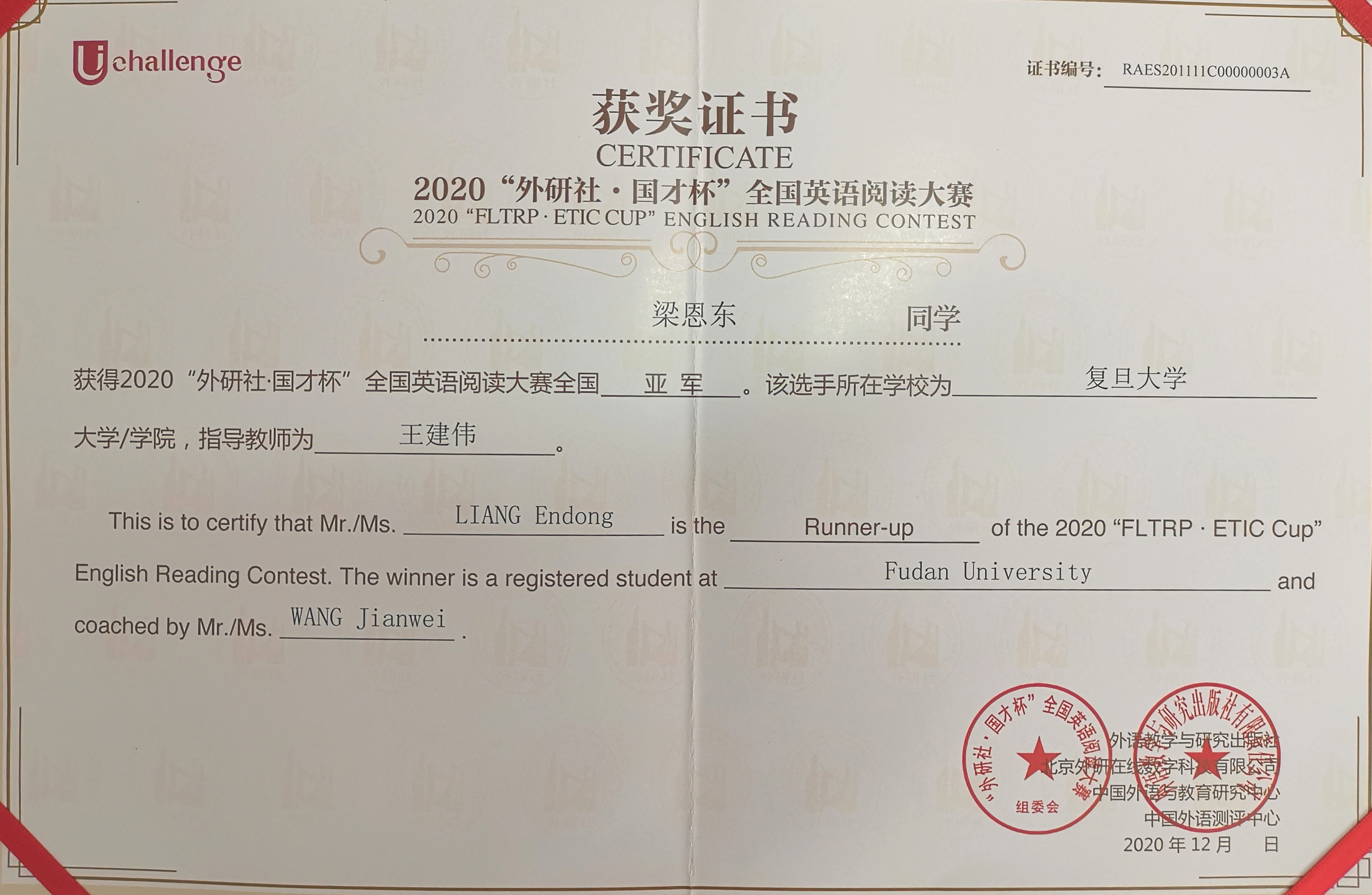 (王建伟老师指导的梁恩东同学获得阅读大赛总决赛亚军)