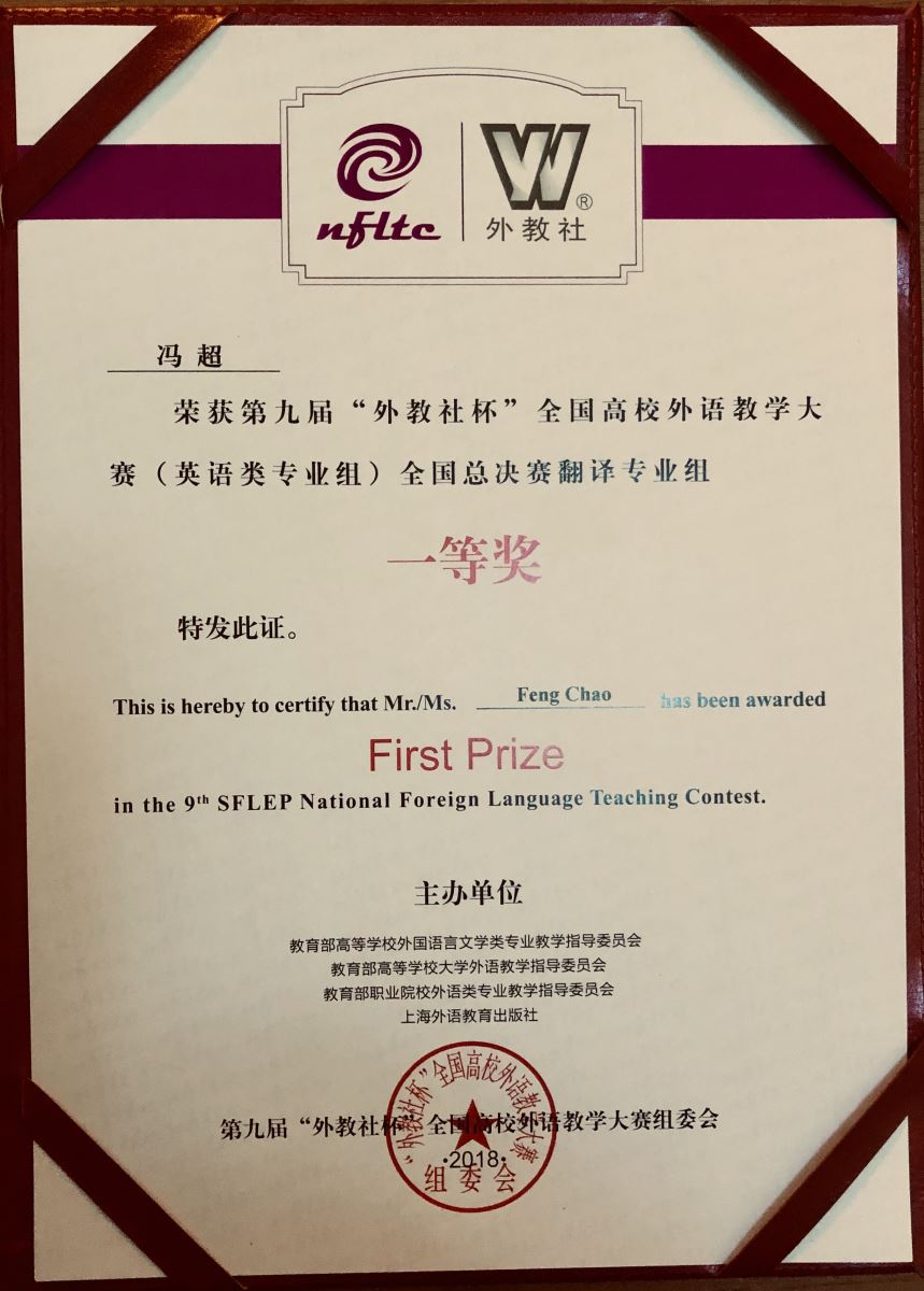 初赛形式为提交选手个人20分钟的授课视频,冯老师选取了“口译实战中的信、达、雅”进行展示,从全国各地近百所高校参赛选手的参赛视频中脱颖而出,并在复赛中获得网络评选和专家评审青睐,最终进入全国16强决赛。全国决赛的评委阵容强大,翻译专业组更是汇集10位顶级专家。决赛内容为针对指定教材进行20分钟的授课展示和5分钟现场问答,冯老师的精心设计,尤其是与学生的现场精彩互动,顺利晋级最后的全国8强总决赛。全国总决赛每位选手只有30分钟的临场准备时间,冯老师凭借丰富的口译实践,在10分钟的说课环节中设计了一堂模拟会议课,并配以PPT展示,条理清晰地展示了教学逻辑和教学步骤,并出色回答了评委的问题,最终斩获一等奖。