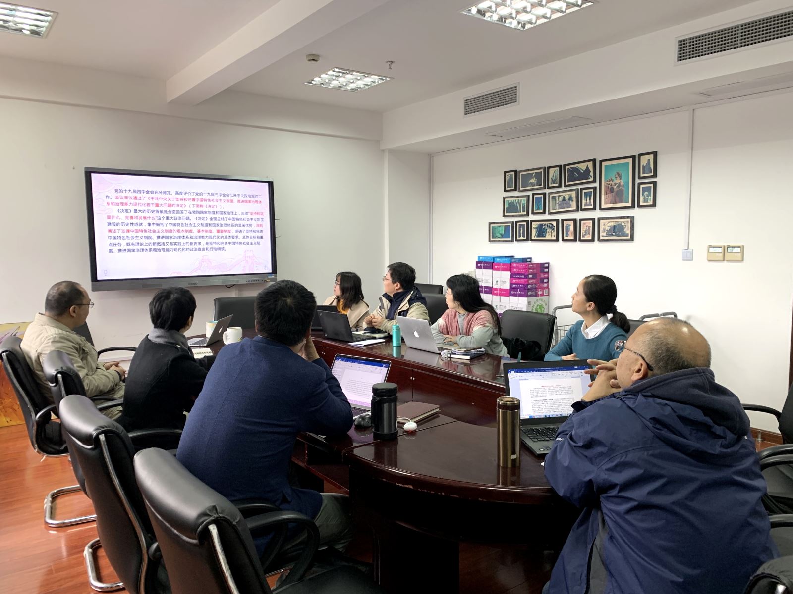 11月25日上午,High漫画 High漫画 党委举行“不忘初心、牢记使命”主题教育第七次集中学习研讨。学院党政领导班子围绕学习贯彻党的十九届四中全会精神,聚焦《中共中央关于坚持和完善中国特色社会主义制度、推进国家治理体系和治理能力现代化若干重大问题的决定》进行交流讨论,党委书记罗英华主持学习。大家在前期自学文件的基础上,分章节导学导读,并进行了交流发言。