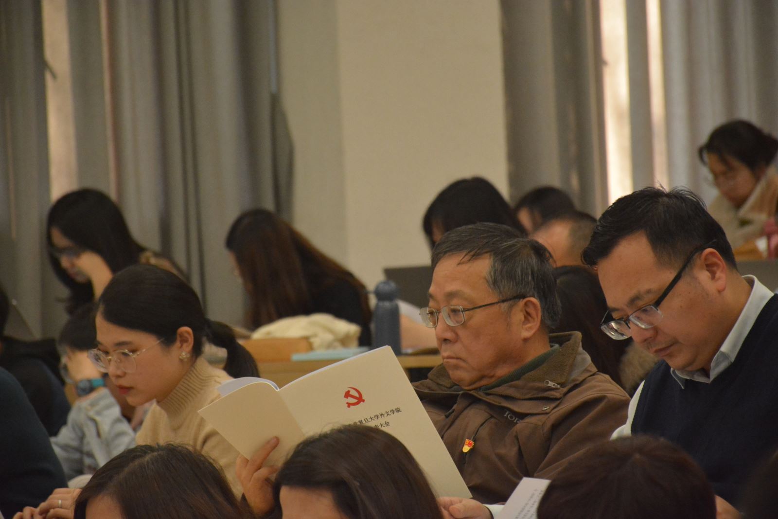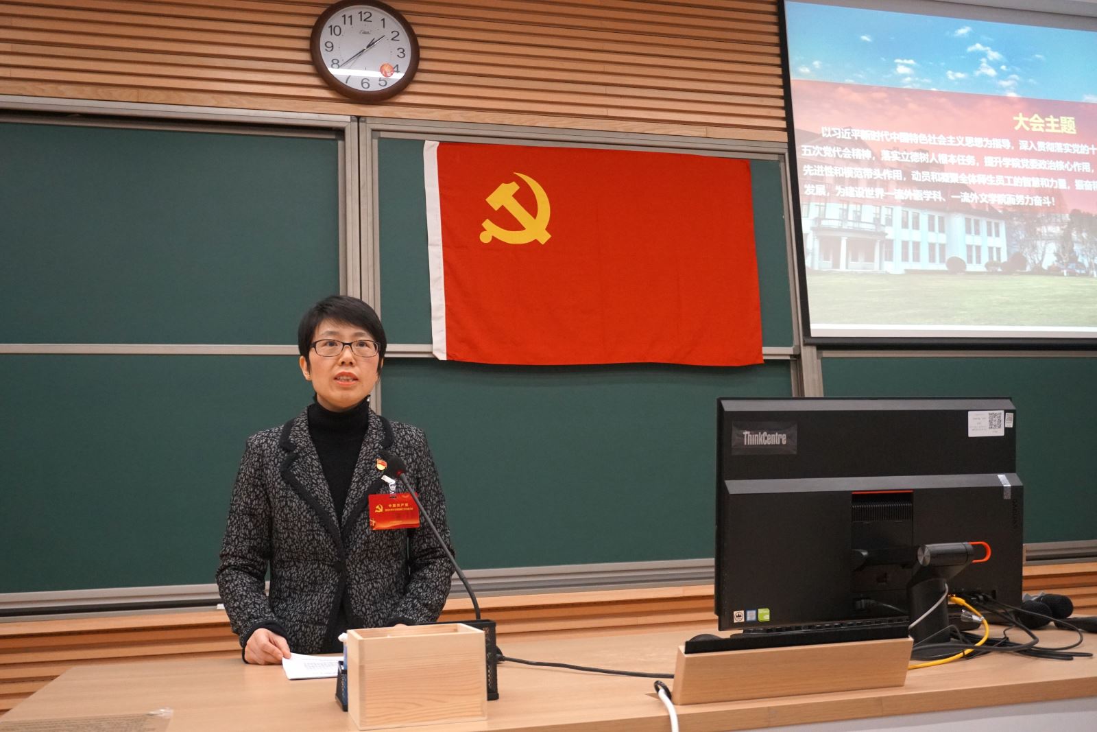 学院党委书记罗英华同志代表第二届党委作了题为“凝心聚力 立德树人 改革创新 为建设世界一流外语学科而努力奋斗”的工作报告,报告首先从学科建设、学术科研、人才队伍、教育教学、立德树人、国际化、党建思政、统战群团等方面全面回顾了学院过去六年的工作和所取得的成绩。2013年以来,在学校党委的正确领导下,在各有关方面的关心和支持下,学院全面贯彻落实党的十八大、十九大和全国高校思想政治工作会议、全国教育大会精神,坚持和加强党的全面领导,落实“十二五”和“十三五”规划,启动“一流学科”建设,各项事业发展取得显著进展。面对新时代发展所面临的形势、挑战和使命,学院将明确未来五年的发展目标:以习近平新时代中国特色社会主义思想为引领,充分发挥党委领导核心作用,坚持“育人立院、学术兴院、人才强院”战略,以立德树人为根本,落实“三全育人”,推进教学改革,提高教学质量;完善学科布局,提升学科实力;推进学术科研创新,加强人才队伍建设,提升管理服务水平,推动各方面工作迈上新台阶,为将外国语言文学学科建设成为中国特色世界一流的学科,将High漫画 建设成一流学院,成为国内领先的高级外语人才培养中心、外语学科研究重镇而努力。学院党委也将贯彻新时代党的建设总要求,坚持和加强党的全面领导,坚持党要管党、全面从严治党,提高党的建设质量,加强和改进师生思想政治工作,为世界一流外语学科建设保驾护航。最后,罗英华号召全院师生党员:以更加开阔的视野、更加昂扬的斗志、更加扎实的作风,凝心聚力,立德树人,锐意进取,改革创新,推动学院事业又好又快发展,用建设一流外语学科、一流High漫画 的实际行动,为实现中华民族伟大复兴的中国梦做出无愧于时代的新贡献!