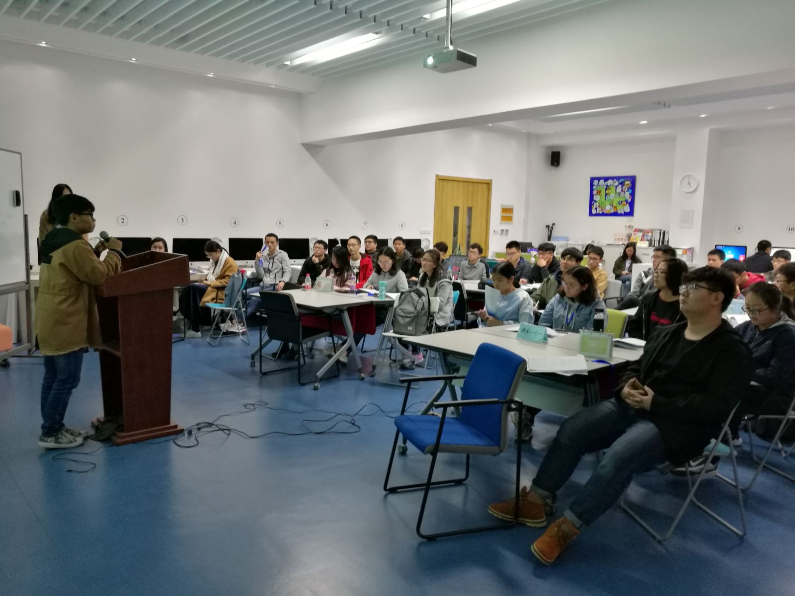 在学员英语能力展示环节,设置了听力游戏、单词游戏和学员节目展示三个部分。在听力游戏中,大家一起参与了歌词填空和新闻听写。在单词游戏中,学员被分为八组,每组派出两名代表上台参加,其他同学则在场下参与游戏。经过一个月的集训,游戏环节对于学员们来说已经不在话下,现场抢答激烈,游戏节奏紧凑,气氛活跃热烈。
