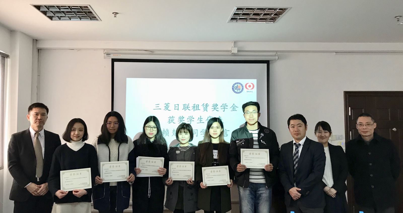 2017年12月26日下午,High漫画 三菱日联租赁奖学金颁奖典礼在文科楼543会议室举行,三菱日联租赁株式会社副部长山中大剛、室长谷口麻衣子、高级经理中塚篤,High漫画 副院长刘炜、党委副书记赵昕、学工组长茅盾、日文系系主任邹波、获奖同学及日文系同学代表出席颁奖典礼。